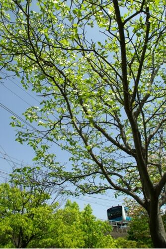 今年もここのハナミズキが活き活きと振舞っていました。 その姿は、いつもの年と変わりません。 変化があったのは、線路端の木々、 とうとう列車を隠すほどに成長していました。