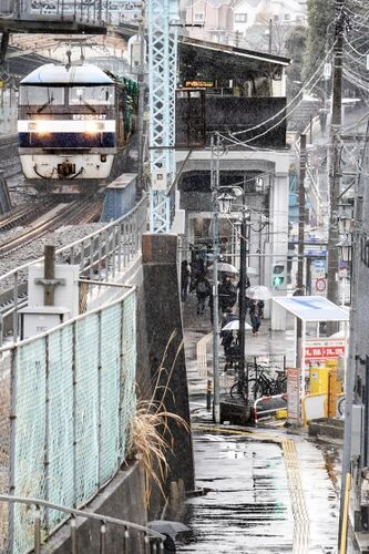 1068レ撮影後は、30分以上貨物列車は来ないのでおかめ桜を見ながらまったりしていると2番線を列車通過のアナウンスが聴こえてきます。それが1068レ通過の9分後の事。 何?何?この時間、踊り子号も来ないはずだよな遅れ貨物列車???とりあえず…