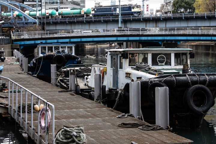 2022-12-25 EF65 2085 大岡川の係留船 JR貨物画像展示場 大岡川の河口に近い大江橋と弁天橋の間には、港湾関係の作業船の係留桟橋があり船溜まりになっていて港町横浜の面影を強く残しています。